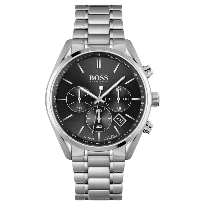 BOSS Chronograph 1513871 łączy w sobie sportową precyzję z nowoczesną elegancją. Efektowna 44-milimetrowa koperta ze stali nierdzewnej w kolorze srebrnym idealnie komponuje się z czarną tarczą i nadaje temu męskiemu zegarkowi BOSS wyrazisty wygląd.